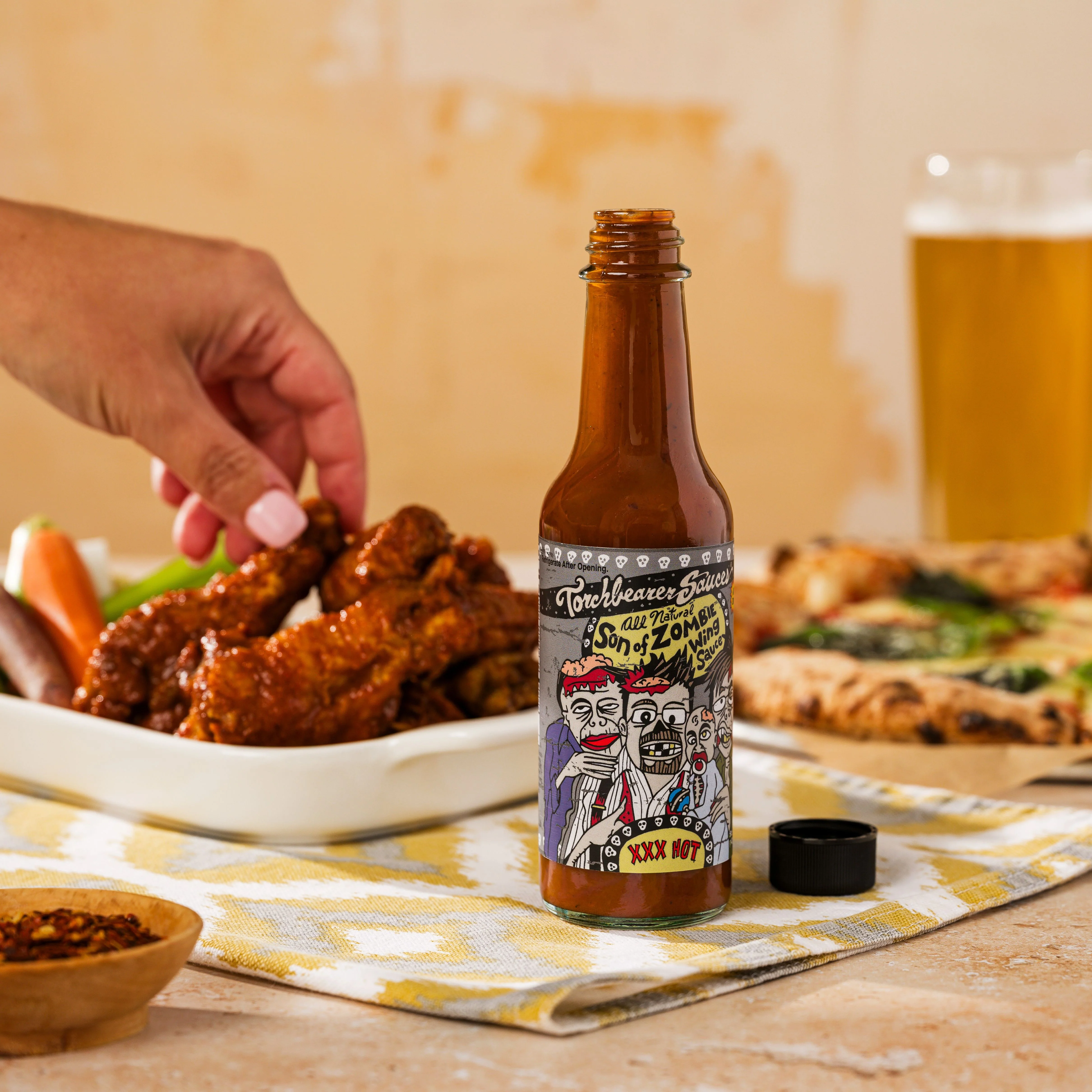 (Featured on Season 6 of Hot Ones) Take a bit of sweetness, a dash of smokiness, and fill in what’s left with the wrath of the risen dead and you get our Son of Zombie Wing Sauce. This is our first sauce created by a fan who took three other sauces (Chipotle BBQ, Honey Garlic, and everyone’s favorite, Zombie Apocalypse), mixed them together just right, and said “Here. Make this.”. So, we did. This extra hot sauce is fantastic on wings, burgers, chicken fingers, and even in dips and spreads.